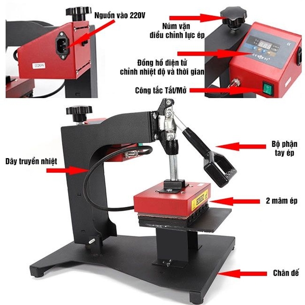 Tay đòn (Cần ép): Cơ cấu đòn bẩy tạo lực ép lớn giúp cố định mâm ép trong quá trình in. Một số dòng cao cấp có thiết kế xoay 360 độ, giúp thao tác lấy sản phẩm dễ dàng và an toàn hơn .