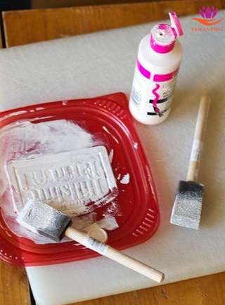 Bước 5: Dùng chổi sơn quét màu lên giấy. Không được để sơn lem ra phía ngoài áo. Chọn màu sơn phải phù hợp với màu áo.